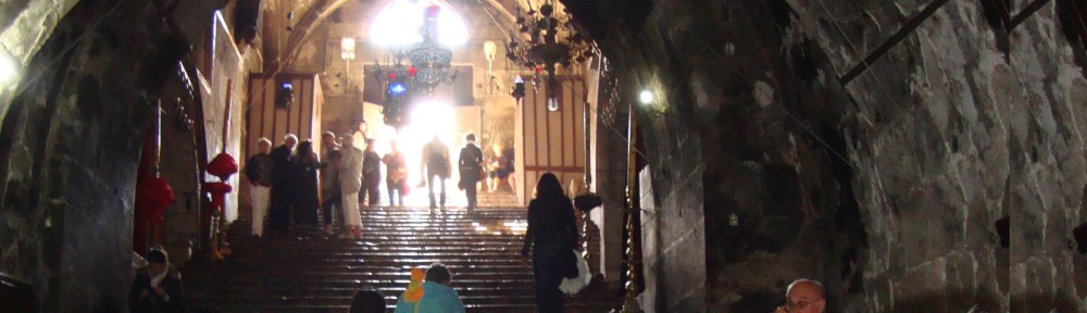 As the awareness settled, I slowly moved along the marble like slippery cobble stones already well washed and whitened by a second day of rain. Crowds were milling around and with no sign of a fellow pilgrim, my only option was to walk towards the Church of the Sepulchre. The message was clear now, ouch… if I face the pain of life and take up my cross, hurtful though it be, it will lead to peace, joy, happiness ..and resurrection.